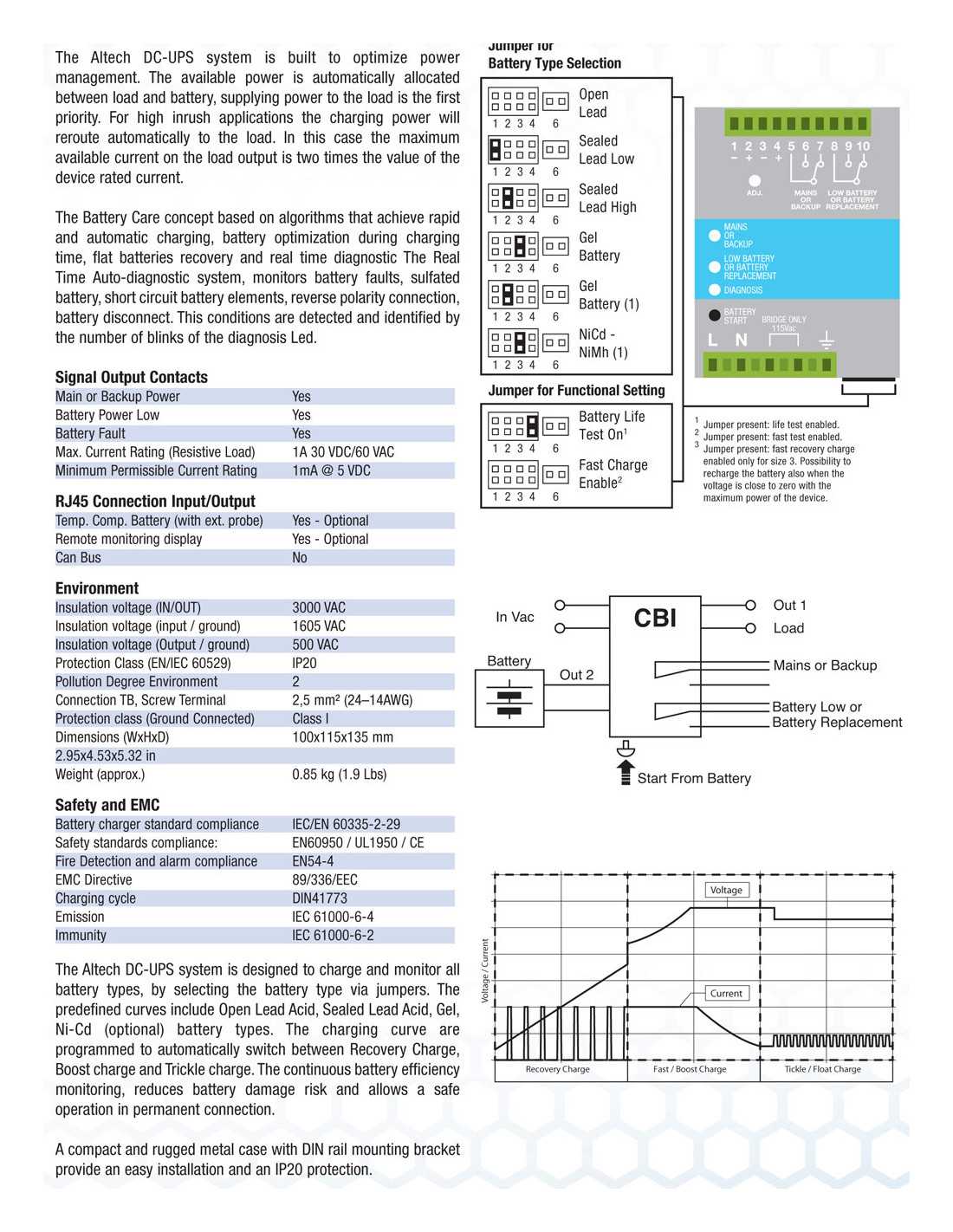 - Signal output (contact free) for fault battery state